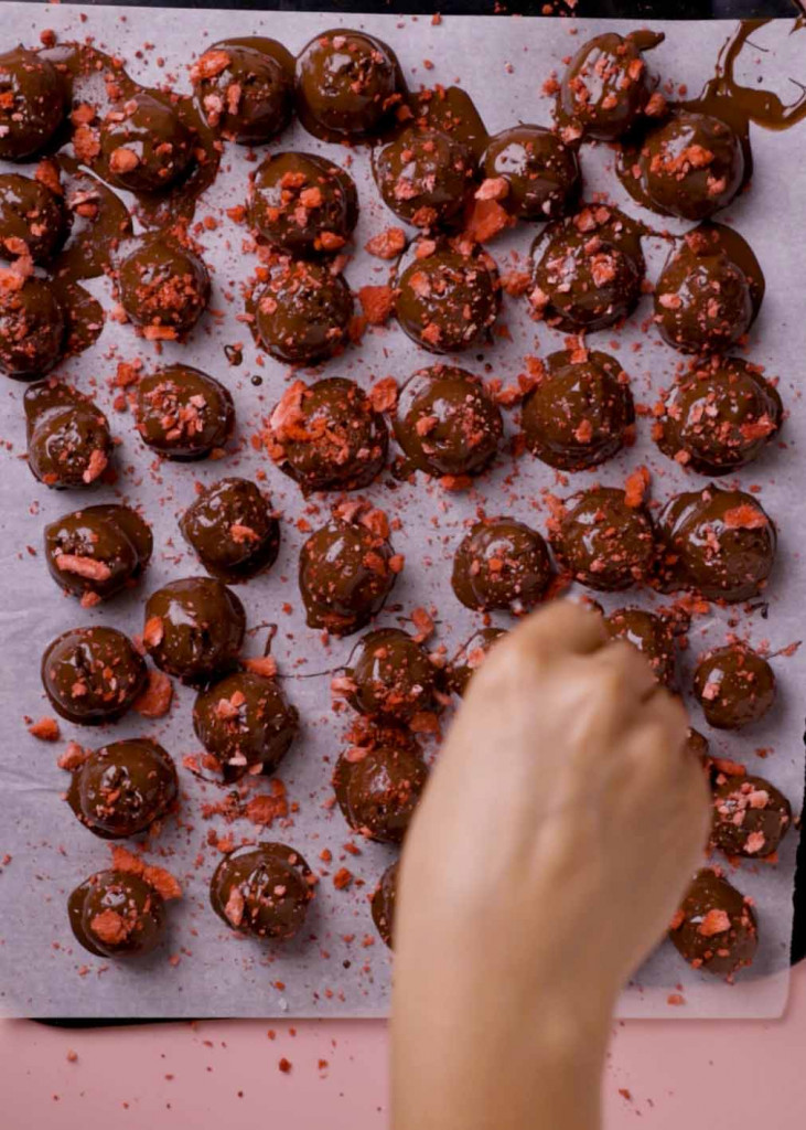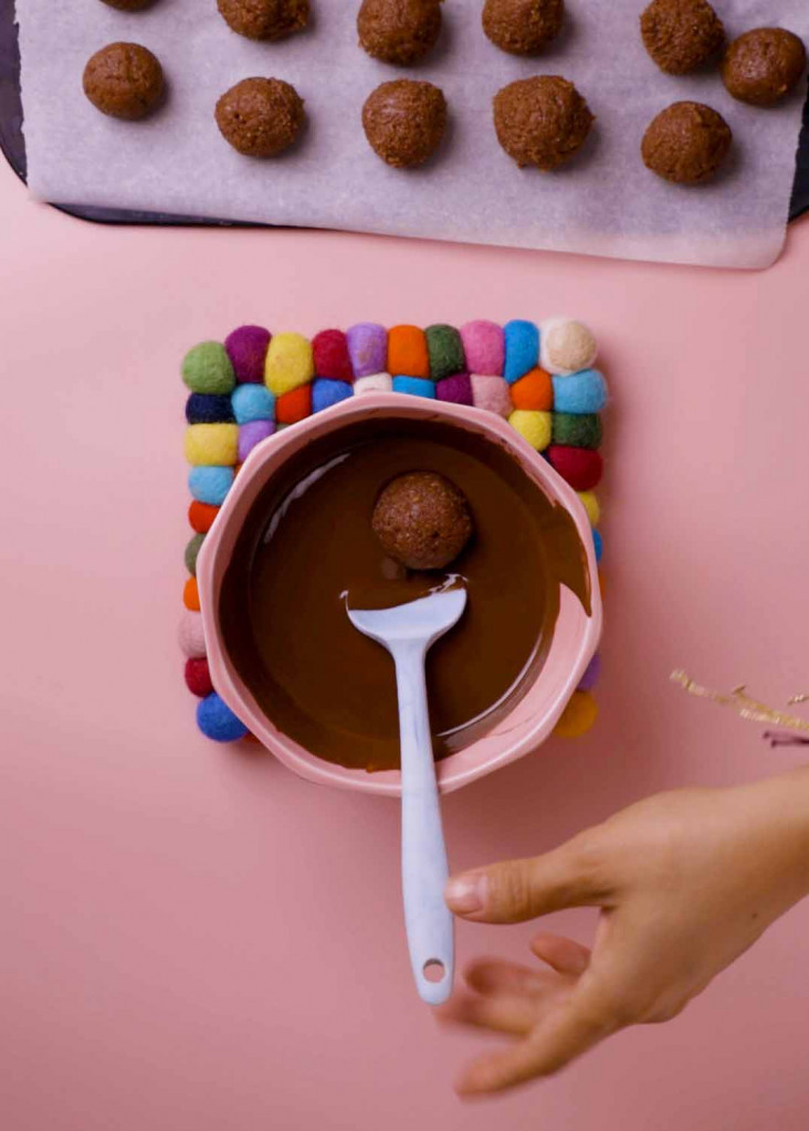 Roll the truffles in the melthed chocolate and place them on top of a parchment paper